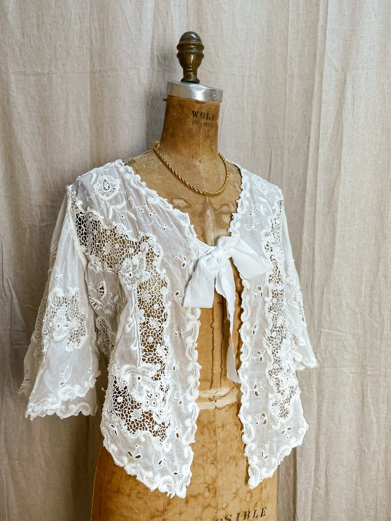 DESCRIPTIONIncredible Edwardian lace jacket. Now has ribbon sewn on to tie shut, but can easily be removed if new owner prefers. Would be so cute worn over a bralette for summer. Top is in great condition for age. It has one small mend on back of neck but otherwise no major flaws.